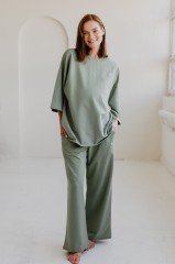 Szerokie spodnie ciążowe - miętowe to nowoczesny, modny krój w unikalnym kolorze. Delikatna zieleń nadaje charakteru, a elastyczny pas i miękka dzianina zapewniają wygodę w ciąży i po porodzie.